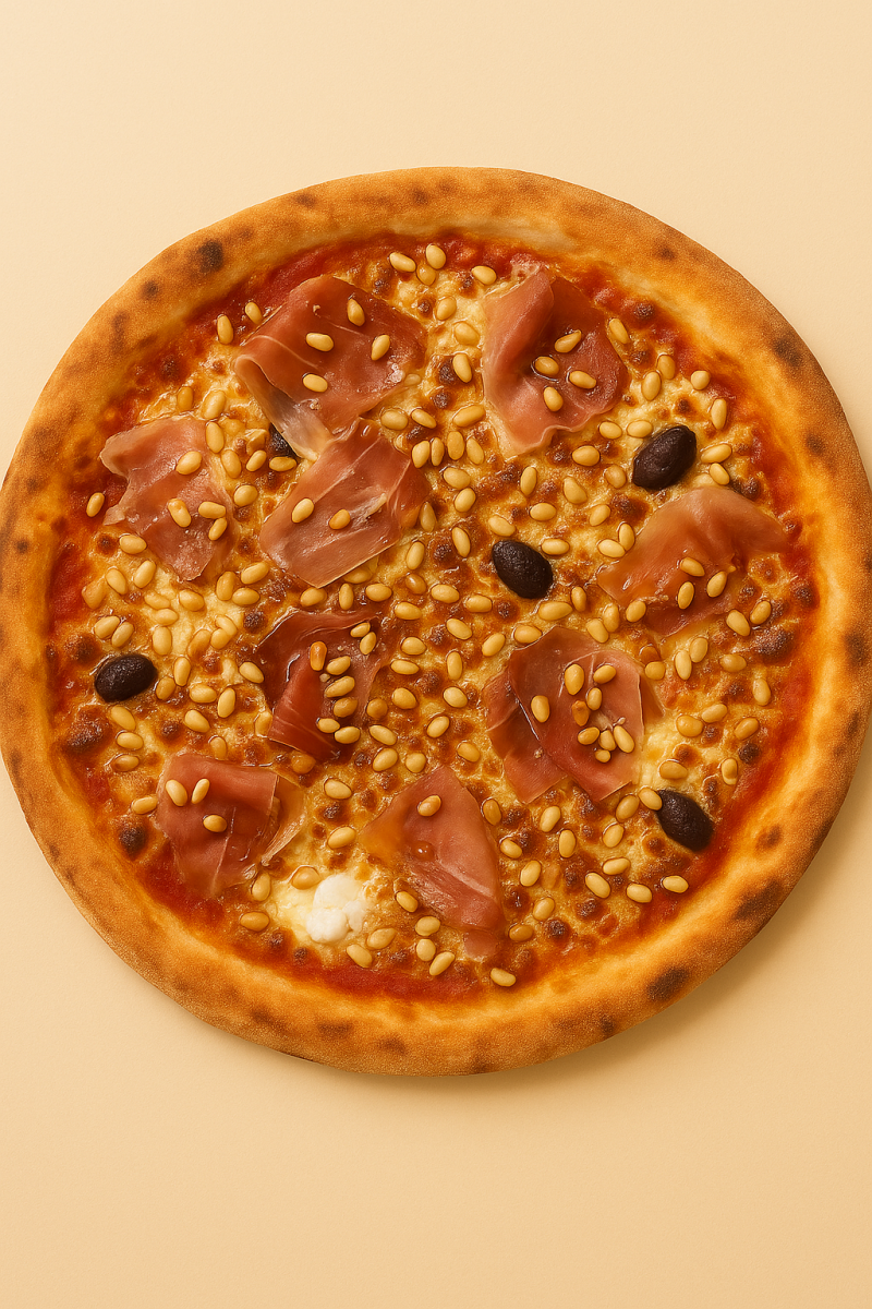 Polpa fine - Mozzarella – Pignons de pin - Chèvre -Miel - Jambon cru (ajouté après cuisson) - Olives – Origan