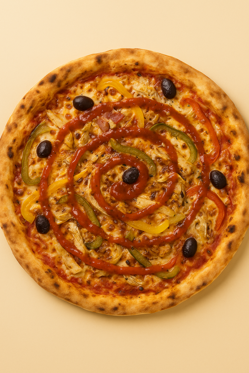 Sauce Tomate - Fromage - Poulet - Poivrons marinés - Oignons cuits - Olives - Origan - Sauce pimentée - Epices mexicaines