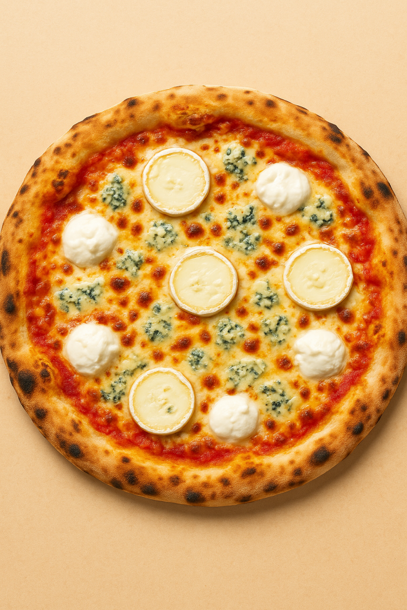 Polpa fine - Mozzarella – Tranches de chèvre – Roquefort doux - Mozzarella di Bufala AOP (ajoutée après cuisson) - Olives – Origan